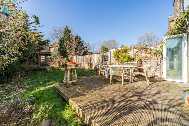 Decking area immediately out from the kitchen, lawn, mature plants and trees, shed at the rear, side access via garage.